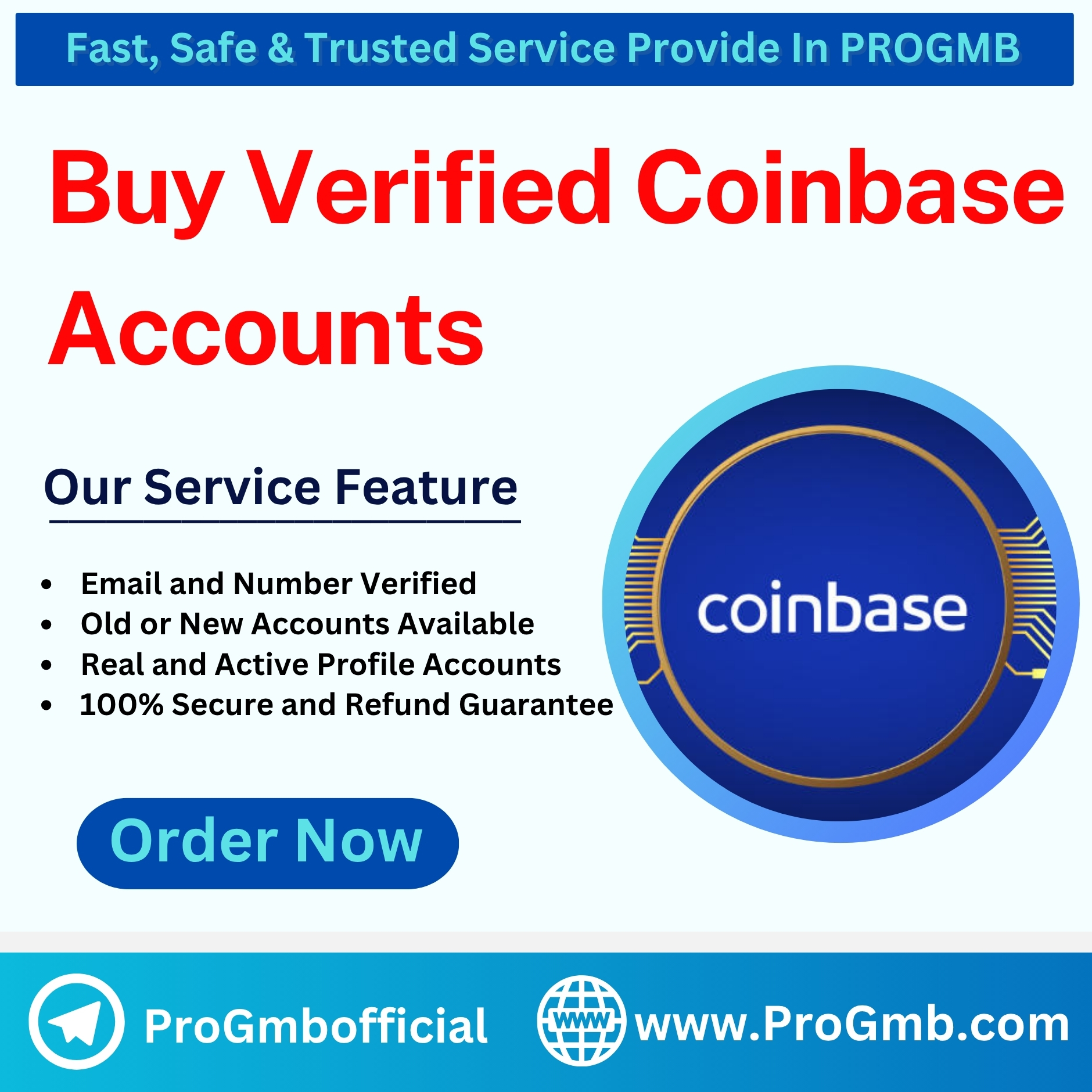- You can rely on them for all your Coinbase account needs. There are many benefits to buying a verified Coinbase account from PROGMB.com. It is a safe and easy way to enter the world of cryptocurrency. Whether you are experienced or new, PROGMB.com helps you navigate the market smoothly.
